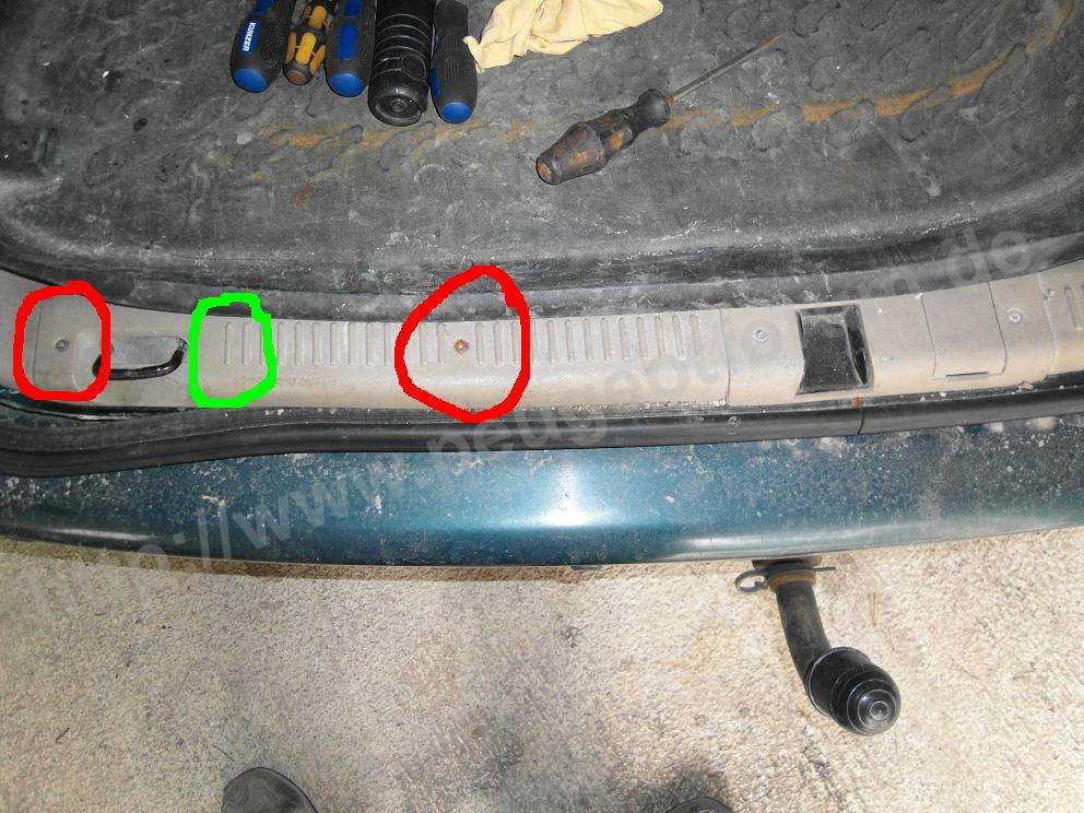 Die rot markierten Schrauben entfernen. Je nach Modell kann die Zierleiste noch eine dritte schraube haben (gr?n markierter kreis)