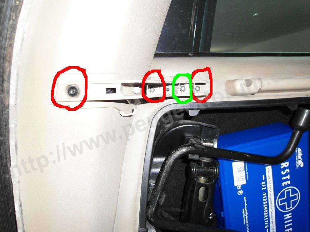 Die Halterung f?r die Hutablage weg schrauben. Dazu die rot markierten Schrauben l?sen. Die gr?n markierte Schraube ist wahlweise je nach Modell vorhanden.