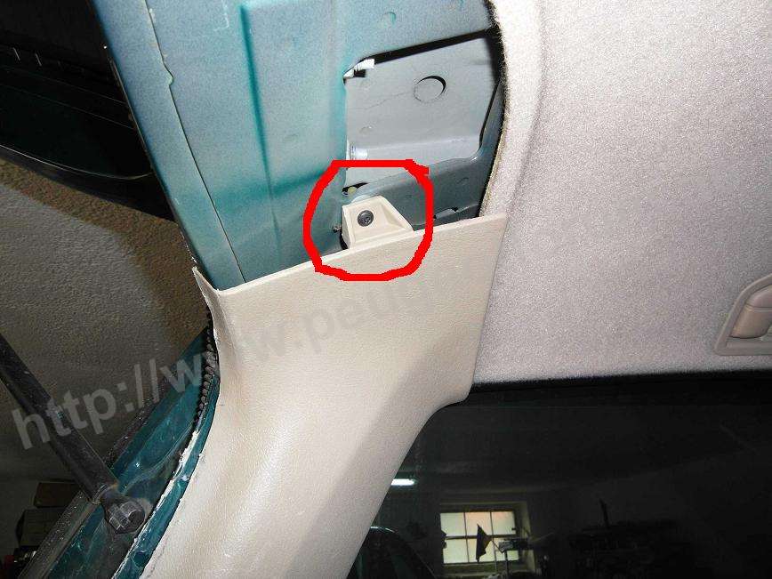 Unter der Verkleidung die rot markierte Schraube an der Decke f?r die D-S?ulenverkleidung l?sen.