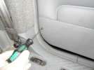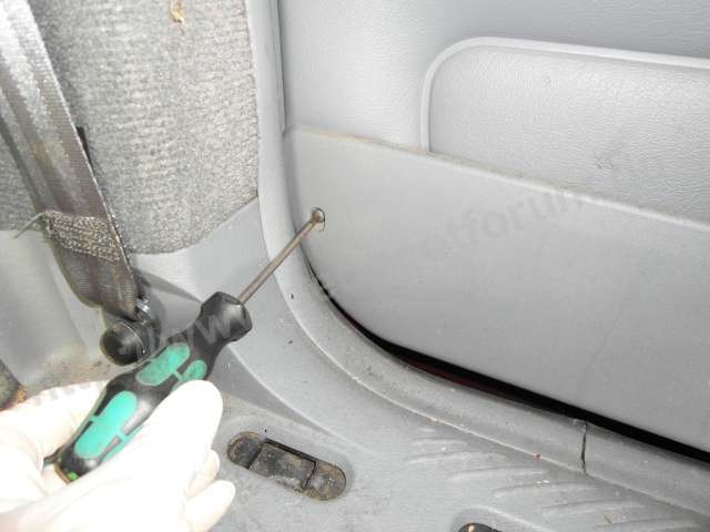 Ist der vordere Teil der T?rpappe gel?st, die Schiebe T?r ca 10 - 15cm ?ffnen. So, das der hintere Teil der T?r sich gerade von der Karosse hebt und man gerade noch mit den Fingern hinter die T?rpappe zum raus hebeln greifen kann.