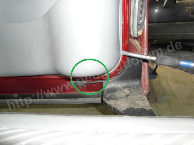 Jetzt zum T?rpin. Das ist eigentlich das schwerste. Am T?rpin ganz unten ist ein kleiner schlitz. Da drunter sieht man eine schwarze Verriegelungsnase. Diese ist f?r einen schlitten, der den T?rpin mit dem Gest?nge verkeilt. Jetzt muss man mit einem kleinen Schraubenzieher (kleiner als der gezeigte) die Verriegelungsnase rein dr?cken und den Schlitten vorsichtig runter hebeln. Dabei den T?rpin ganz vorsichtig nach oben ziehen. Ist der T?rpin Sp?rbar oben auf Anschlag, muss der Pin Richtung Fahrzeugmitte gehebelt werden, da er noch zus?tzlich in einer F?hrungsschiene in der T?rverkleidung sitzt.