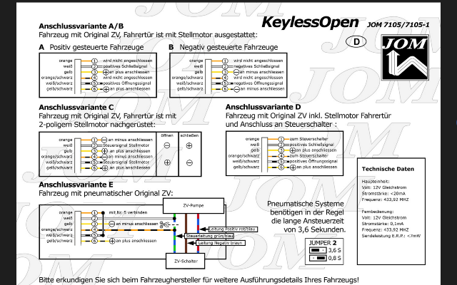 Hat jemand Erfahrung damit und kann mir sagen welche Art von Zentralverriegelung ich in meinem 307 habe (die FIN lautet: VF33H9HZC84445867). Laut der Einbauanleitung der Fa. JOM gibt es ja mehrere Möglichkeiten (siehe Bild im Anhang).