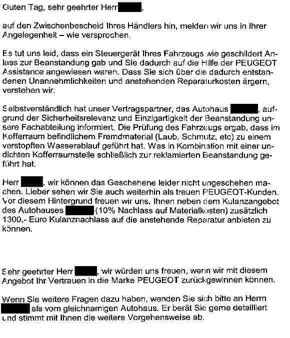 Gespannt öffnete ich den Brief also, nur um zu sehen, dass ich billig abgespeist werden soll. Hier ein Auszug: Immerhin 1.300 € Kulanznachlass sind bei Peugeot Deutschland „ein Anlass zur Freude“, für mich aber nur ein Tropfen auf den heißen Stein, wenn man den kompletten Umfang des Schadens sieht. Bis zu dem Zeitpunkt war ich sogar noch bereit, das defekte Steuergerät zu zahlen, falls ich den Schaden durch Unachtsamkeit verursacht hätte.