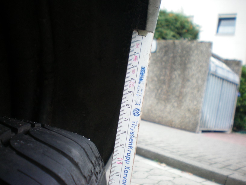 Ich habe vom Reifen zum Schwingarm ca. 5 mm gemesen und zum inneren Radlauf ca.9 mm.