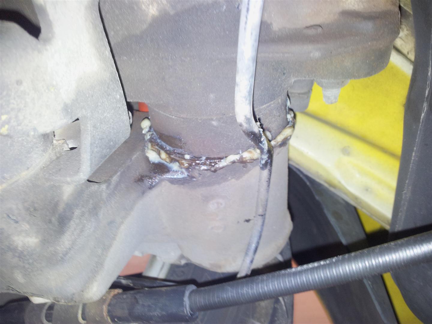 2x Rundkopf M6 gesetzt so ungefähr Mitte zwischen den Verjüngungen, auf der Beifahrerseite reingepumpt wie blöd,
