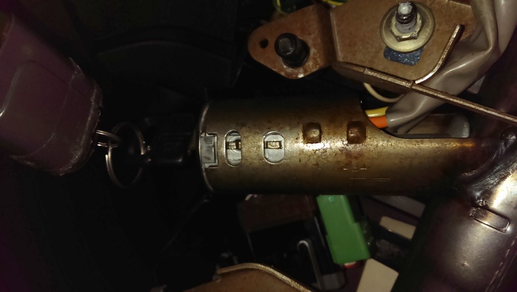 Gut, also alles ausgebaut und angeschaut. Der Bolzen gleitet bei drehen des Schlüssels ganz leichtgängig vor und zurück. Und nach meinem Dafürhalten geht der Bolzen nicht weiter raus als er es bei abgezogenem Schlüssel tut und da ist er eben so kurz, dass er nicht in die Lenkstange greift, siehe Bilder.