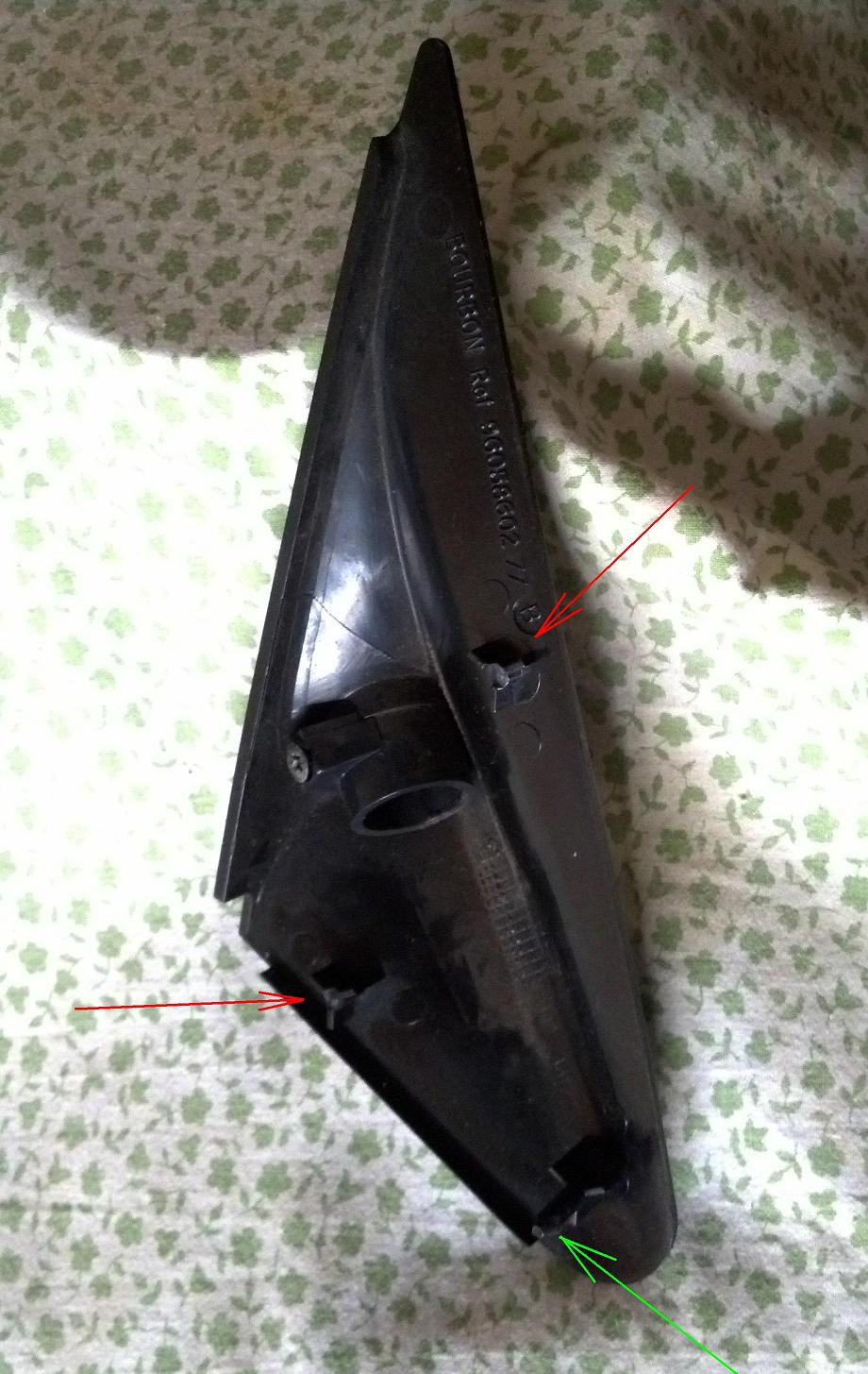 Die zwei Spiegeldreiecke würde ich sehr gern nehmen, wenn die drei Stifte auf der Innenseite noch intakt sind (siehe Foto, da sind die oberen zwei abgebrochen). Da muß man bei der Demontage sehr sehr vorsichtig sein. Was sollen sie denn kosten? Wie sieht es denn mit der Handschuhfachklappe aus und was hättest du denn sonst noch so an Teilen? Bin zur Zeit dabei, mir ein kleines Ersatzteillager anzulegen.