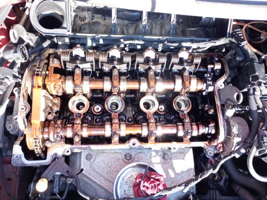 Als ich den Ventildeckel runter hatte habe ich mal mit einem Schraubenzieher gegen das Kettentrum , das zur Einlassnockenwelle hoch läuft gedrückt. Da hatte ich den Eindruck, dass die Spannung geregelt wird. Der Halter, der die Kette zwischen Einlass- und Auslassnockenwelle führt, der war vor 40 000 km schon mal gebrochen. Das gab so ein Klappergeräusch beim Anlassen. Da war ich jetzt auch unsicher. Aber der ist noch an Ort und Stelle. Und nicht kaputt.