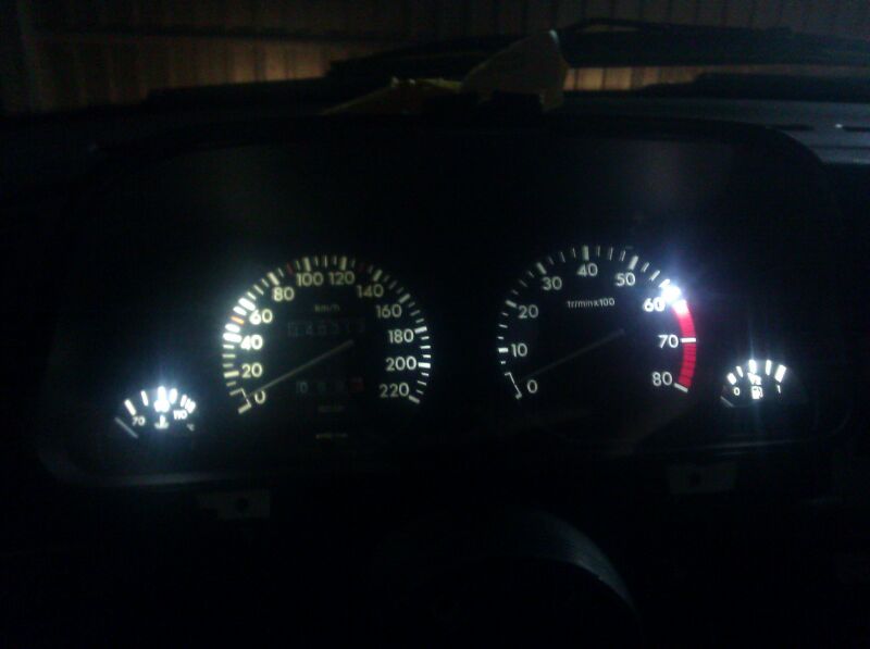 Im hellen leider nicht so gut zu sehen. Im Dunkeln ist dech Tachostand schlecht zusehen, aber die Ausleuchtung ist bzw. war Perfekt, die helligkeit ist etwas dunkler als beim Serienzustand. Diese Methode klappt ohne den gelben Lack auf den Scheiben zu entfernen. Man kann ja bei Original Birnen ja mit der Farbe experimentieren!