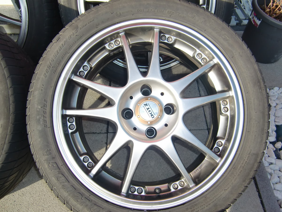 Hi ich biete hier einen Komplettradsatz von Dotz Brands Hatch 7x17 4/108 ET 15 mit Sommerreifen 225/45/ZR 17 von Goodride an. Die Felgen sind einwandfrei ohne Kratzer oder sonstige Schäden. Sind zwei Sommer gefahren und zwei Jahre haben sie jetzt gelegen. Die Reifen haben alle noch 3,5 bis 4mm Profiltiefe. Die Felgen können auch ohne Reifen erworben werden. Preis Komplett mit Reifen ca. 600€ VHB und ohne 400€ VHB