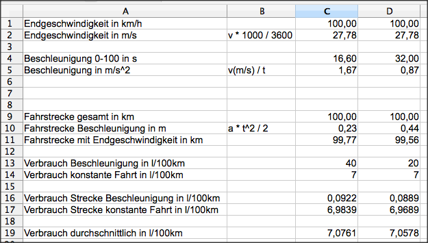 da hier gerade so schön eine Physikweiterbildung (s. http://www.peugeotforum.de/forum/viewto ... 9&t=119574) läuft und wir gestern Abend auf das Thema "schnell oder weniger schnell beschleunigen" gekommen sind, hier mal meine Frage in die Runde. Es geht darum, ob es besser ist, wenn man schnell beschleunigt und damit einen erhöhten Verbrauch in Kauf nimmt, der sich dann aber auf längerer Strecke wieder relativiert, da man schneller auf die Endgeschwindigkeit gekommen ist oder ob es besser ist, langsam zu beschleunigen, weil der Verbrauch da besser ist. Ich bin ja für's erstere. Um das Vergleichen zu können, habe ich mal in meinem kargen Physikwissen gekramt und es kam die Excelberechnung im Anhang raus. Nur ist die Frage, stimmt das auch so?