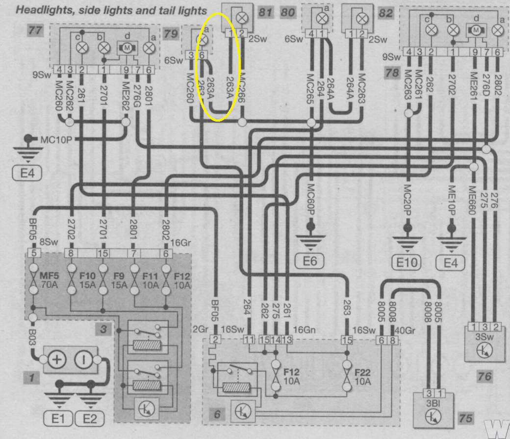 Danach habe ich mir von motor-talk.de den Stromlaufplan für die Rücklichter heruntergeladen. Anbei der für das Problem relevante Ausschnitt mit der Markierung, welche Verbindung fehlerhaft war.