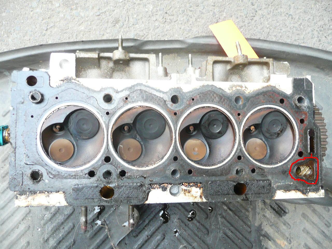 an der berüchtigten stelle wo ja wohl alle tu´s mal anfangen hat er in den block (nicht in den kopf wie hier im bild) eine kleine nut mit einem kleinen schraubendreher geschlagen die ein ablaufen des öls in richtung ölrücklaufkanal ermöglicht, auf dem bild rot eingezeichnet - nur etwas besser als meine krakelige zeichnung. ich finde leider kein passendes bild, man muß es sich eben auf der anderen gegenüberliegenden seite vorstellen.