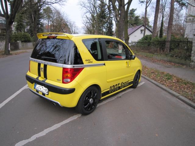 Im Dezember 2009 habe ich einen Peugeot 1007 in der Ausführung "110 2-Tronic Sport Limited Edition" gekauft (s. beigefügte Bilder Eigenes Fahrzeug (1) und (2)). Diese Limited Edition hat einen Front- und einen Dach­heckspoiler sowie eine Tieferlegung und BBS-Alufelgen im Sommer. Die Wagenfarbe ist gelb und an den Schwellern ist ein großer Aufkleber mit dem Schriftzug "1007 Sport" an­gebracht. Auf den C-Säulen befinden sich ein kleiner Schriftzug "Limited Edition" und zwei kleine Löwen im RC-Design. Die Erstzulassung erfolgte 2005.