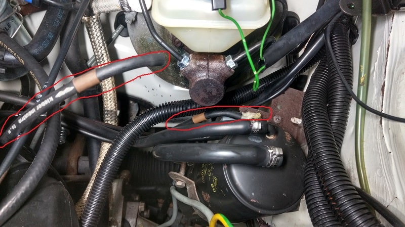 Der Schlauch wie markiert geht von der Einspritzung zum Ventil (sitzt links beim Bremskraftverstärker)