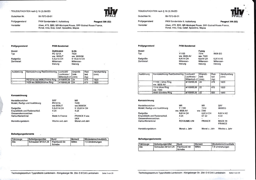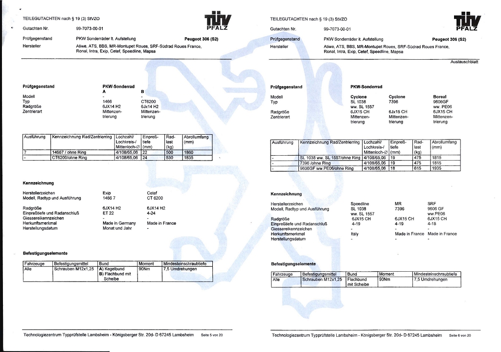 Moin, das gibt ein Gutachten vom TÜV Pfalz Nr 99-7073-00-01 für die Ouragen 9606JS mit 205/45r16 für den 306S2