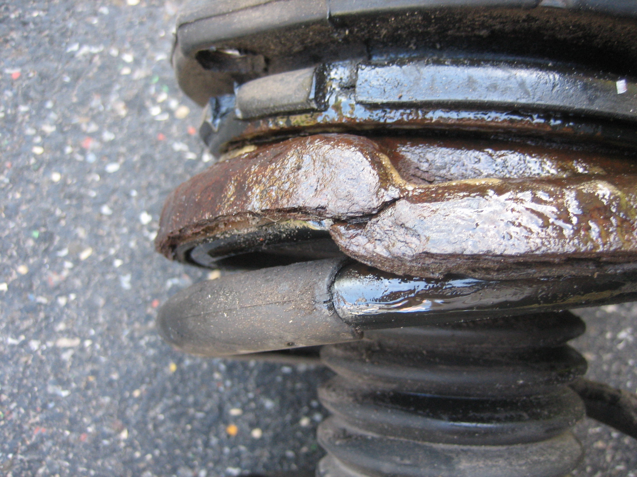 dann querlenker und federbein raus, beim federbein sieht man oben am teller einen riss, wahrscheinlich drückt die feder den teller richtung wälzlager, daher die geräusche.