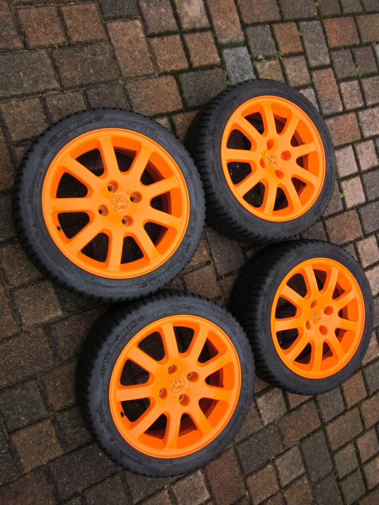 Winterkompletträder passend für diverse Modelle, z.B. 206,306,309,405,... es handelt sich um original Peugeot Alufelgen vom Typ Ouragan in der Größe 6,5x16 ET 28. Die Felgen wurden sandgestrahlt und in strahlendem Orange pulverbeschichtet.