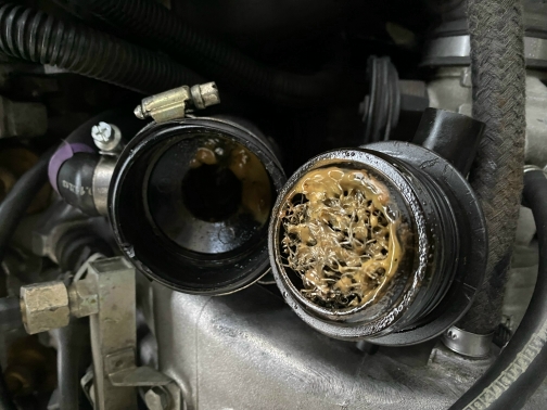 Den 2 poligen Stecker habe ich gefiunden und überprüft, das sieht gut aus. Der Fühler hat einen Widerstand von 45 Ohm. In dem Schlauch zu dem Aluminiumkasten war kein Kühlwasser. Daraufhin habe ich den Kühlmittelausgleichsbehälter geprüft, da war nur ganz wenig Wasser drin, welches zudem ölig aussah. Das Motoröl sah am Peilstab normal aus, keine Wassertropfen oder milchige Farbe.